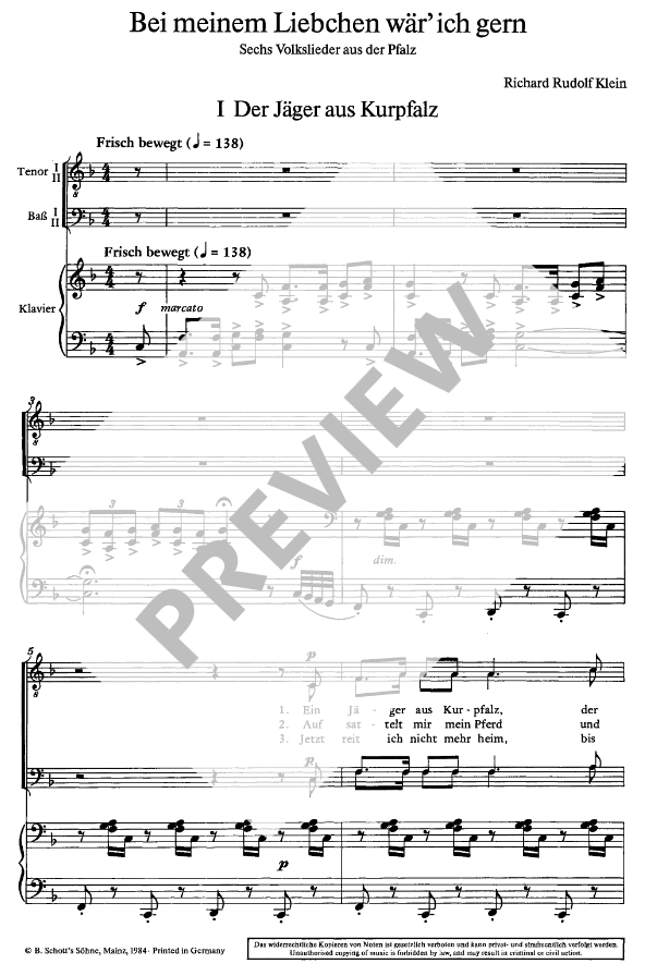 Bei meinem Liebchen wär' ich gern (6 Volkslieder aus der Pfalz) (mannenkoor; Tenor, Tenor, Bass, Bass; begeleiding), pianouittreksel