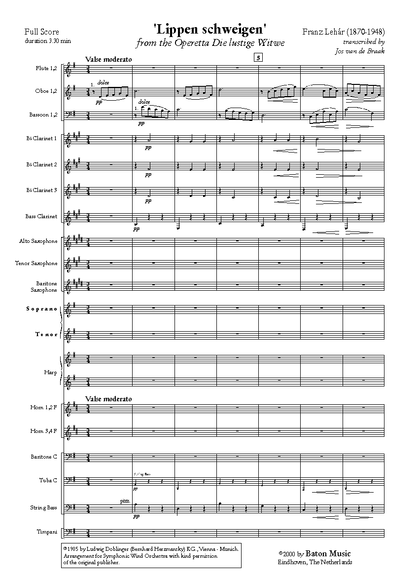 Aanvullende informatie/inhoud "Die lustige Witwe", gecomponeerd door Franz Lehár is een van de absolute hoogtepunten in het hele operette-repertoire. Het duet "Lippen schweigen" - Liefde onuitgesproken - is een wals in een zeer romantisch jasje. Deze transcriptie is een orkestversie van deze populaire melodie.