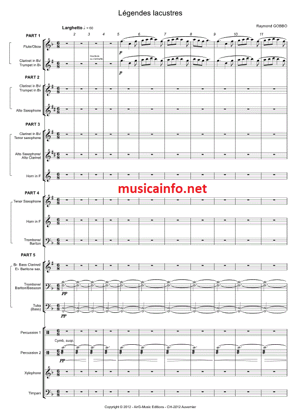 Aanvullende informatie/inhoud Raymond Gobbo's "Legendes lacustres" presenteert een muzikale interpretatie van waterlegendes, gebruikmakend van de specifieke sonische mogelijkheden van een flexibel blaasensemble. De compositie combineert thematische diepgang met een grote sonische diversiteit en biedt zowel uitvoerders als luisteraars een spannende benadering van mythologisch en natuurgeïnspireerde muzikale inhoud.