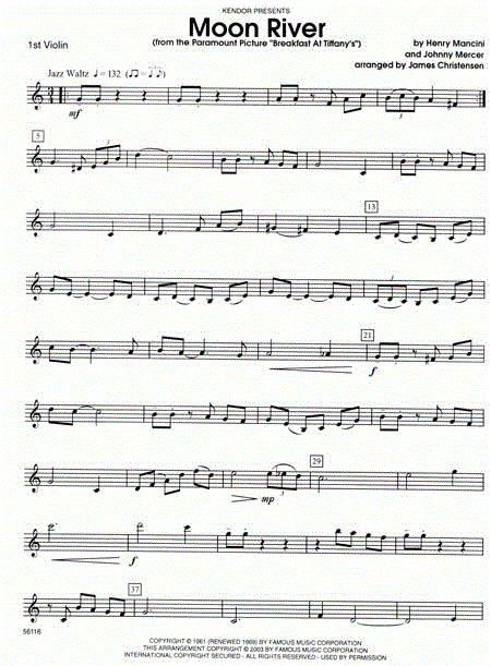 Aanvullende informatie/inhoud This arrangement of one of Henry Mancini and John Mercer's most beloved melodies has been skillfully adapted for Kendor's highly acclaimed and rapidly expanding series for jazz strings. As in all charts from this series, the rhythm section parts are optional, but add considerably to the flow of the jazz waltz. The solo section can be played by any string player using as is or ad lib solos, or the section can be eliminated altogether. Audiences will love this time tested classic from the Paramount Picture Breakfast At Tiffany's. Duration 1:50 without solos.