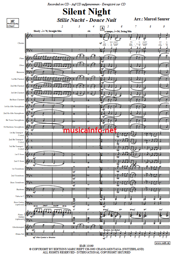 Silent Night (Stille Nacht / Douce Nuit) - klik hier Silent Night (Stille Nacht / Douce Nuit) (harmonieorkest; oder; fanfare; gemengd koor), partituur en delen