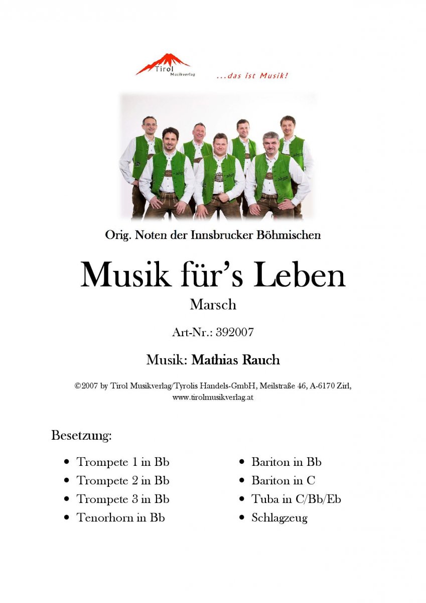 Musik für's Leben - klik hier Musik für's Leben (Marsch; 3 trompet Bb; tenorhoorn; bariton; tuba; drumstel), Samenvatting van de partituur en stemverzameling
