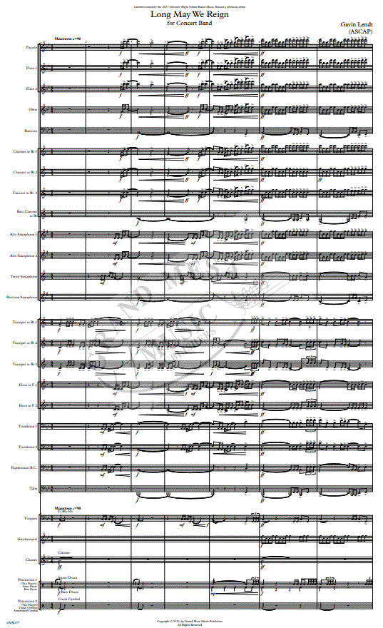 Aanvullende informatie/inhoud “Long May We Reign” is het eerste deel van een grootschalig bandwerk in opdracht van de Denison High School Music Boosters om 100 jaar bands in Denison, Iowa te vieren. Het begint met een heroïsche en grandioze melodie die door de trompetten wordt ingezet. In de fanfare wordt het schoollied ingevoegd, dat eerst door de hoorns werd geïntroduceerd en later door verschillende secties en solisten werd doorgegeven. Na de inleidende fanfare wordt een nieuwe lyrische en opbeurende melodie geïntroduceerd door de houtblazers. Het stuk sluit af met de fanfare van het begin, maar met toegevoegde percussie en lage koperacrobatiek. De fanfare van “Long May We Reign” zal zeker een publiekstrekker zijn en een fantastische opening voor elk concert.