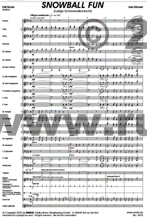 Aanvullende informatie/inhoud Tandis que le Père Noël parcourt le pays en traîneau, il assiste parfois à un spectacle hivernal que nous connaissons tous : une joyeuse et endiablée bataille de boules de neige. Lars Ericsen décrit ce « plaisir tout en blanc » dans sa joyeuse composition « Snowball Fun ». Aux sons typiques de Noël et de l'hiver, comme les grelots et les carillons, l'orchestre résonne de nombreuses boules de neige qui volent et frappent leurs cibles avec un effet accrocheur. Les percussions jouent ici un rôle important. L'ensemble, purement musical, est garanti sans danger et peut ajouter une touche d'humour aux concerts de fanfare, non seulement à Noël, mais tout au long de l'hiver.