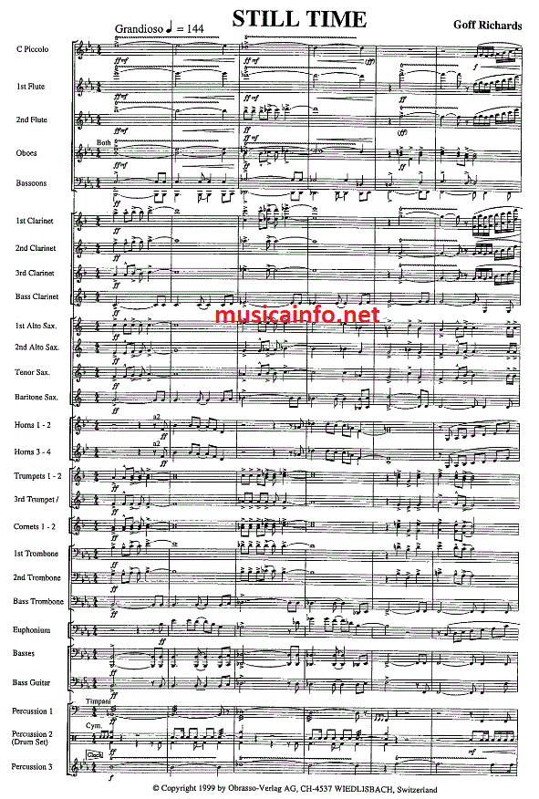 Aanvullende informatie/inhoud "Still Time" als muzikale term beschrijft een bewuste vormgeving van tijd die rust, reflectie en een veranderde perceptie van tijd mogelijk maakt. Goff Richards implementeert dit concept in zijn gelijknamige compositie door middel van een bewuste tempoverandering, een reductie van klank en een lyrische, toegankelijke vormgeving. De titel vormt zo de sleutel tot het begrijpen van het werk: een stuk dat de luisteraar meeneemt op een reis naar een "stilstaande tijd" waarin klank en tijd samensmelten.